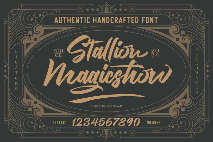 Stallion Magicshow is an authentic handcrafted script font with bold brush strokes, smooth curves, and a natural lettering rhythm—crafted to deliver a strong, stylish, and soulful look. Every character is designed with expressive movement, giving your typography a premium hand-lettered feel that instantly stands out.